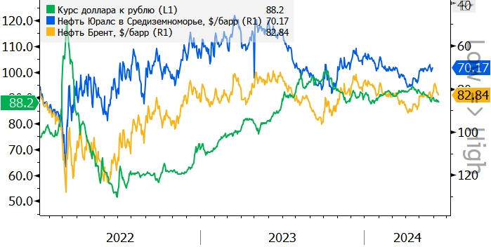 Курс рубля к доллару вырос на 5,8% с середины апреля — лучший результат за этот период среди всех валют стран с развивающимися экономиками. Укрепление рубля, по-видимому, обусловлено ужесточением денежно-кредитных условий и введением санкций в отношении участников российской внешней торговли, а также сохранением высоких требований к возврату валютных средств для экспортеров. Санкции против экспорта энергоносителей привели к задержке платежей в среднем более чем на два месяца, что еще больше снизило чувствительность рубля к спотовым ценам на нефть.