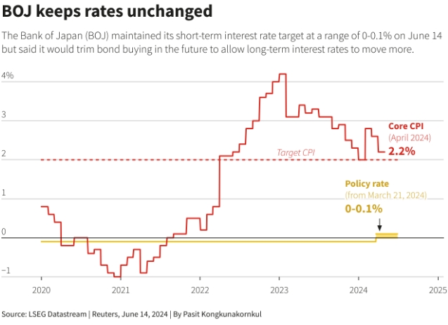Графики Reuters. Банк Японии (BOJ) 14 июня сохранил целевую краткосрочную процентную ставку в диапазоне 0-0,1%, но заявил, что сократит покупку облигаций в будущем, чтобы позволить долгосрочным процентным ставкам двигаться дальше. Базовый индекс потребительских цен (апрель 2024 г.). Цель ЦБ по инфляции. Денежная ставка (с 21 марта 2024 г.),Источник: поток данных LSEG | Рейтер, 14 июня 2024 г. | Пасит Конгкунакорнкул