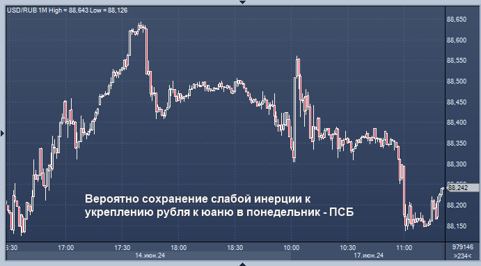 Вероятно сохранение слабой инерции к укреплению рубля по отношению к юаню на торгах в понедельник, чему будет способствовать ослабление позиций юаня на мировых валютных рынках, говорится в комментарии начальника отдела экономического и отраслевого анализа Промсвязьбанка (ПСБ) Евгения Локтюхова.
