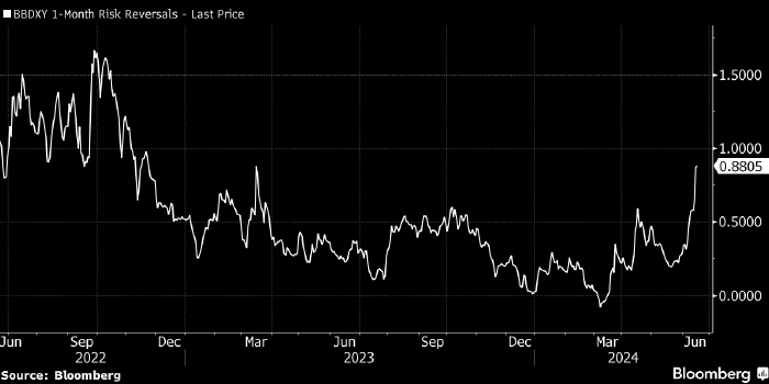 Сегодня премия одномесячных колл-опционов на индекс доллара BBDXY превышает премию аналогичных пут-опционов (одномесячные «risk reversals») уже на 88 б.п. (см. график в начале статьи — прим.), что является самым высоким уровнем с ноября 2022 г. Кроме того, в пятницу данный показатель показал максимальный с мая 2022 г. рост.
