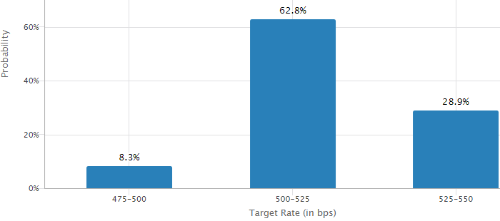 *ProFinance.ru: 12 июня Комитет по операциям на открытом рынке ФРС США (FOMC) представил обновленные макроэкономических прогнозы, включая медианный прогноз членов FOMC по динамике процентной ставки (так называемый «dot plot»). Он предполагает лишь одно снижение ставки по федеральным фондам на 0,25% в этом году, тогда как рынок производных инструментов закладывается на два. Предполагается, что первое из них состоится 18 сентября, и фьючерсы оценивают вероятность такого события в 62,8%