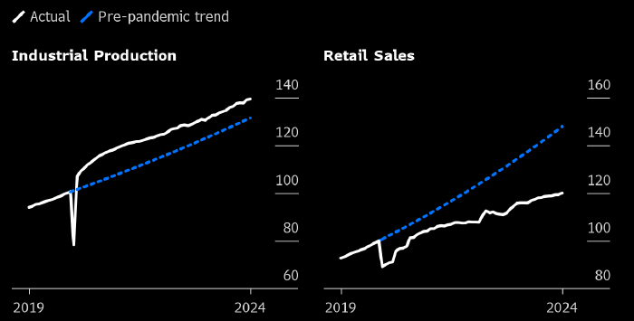 Слева: динамика промышленного производства в Китае (белым) и соответствующий допандемический тренд (синим). Справа: аналогичные данные по розничным продажам. За базу на уровне 100 пунктов принят показатель декабря 2019 года. Источник: Bloomberg