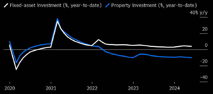 Китай: инвестиции в основной капитал (белым), инвестиции в недвижимость (синим) (в % г/г). Источник: Bloomberg