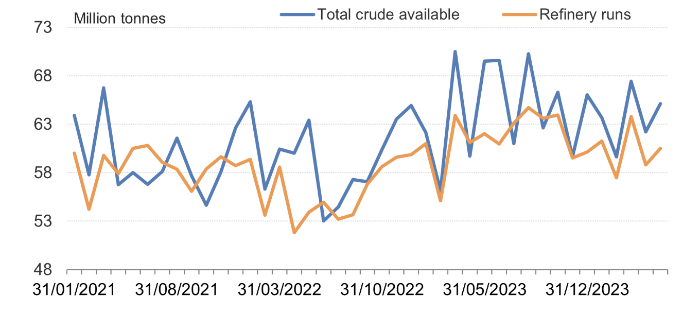 Импорт сырой нефти составил 11 млн баррелей сырой нефти в сутки за первые пять месяцев года, что на 130 000 баррелей или на 1.2% меньше, чем за тот же период в 2023 году. Переработка на заводах сократилась на 50 000 баррелей, и к запасам добавлялось по 790 000 баррелей в сутки.