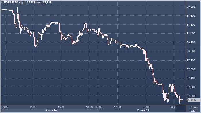 Цена однодневного фьючерса с автопролонгацией USDRUBF на 19:00 мск составляла 87,97, на 163 копейки ниже закрытия в пятницу. Индикативный расчетный курс доллар/рубль, рассчитываемый через кросс-курс CNY/RUB и межбанковский курс USDCNY, снизился примерно на 1,5 рубля до 86,894 рубля за доллар.