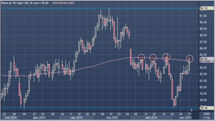 Для котировок нефти Brent текущее значение 200-дневной МА приходится практически на уровень 84 доллара за баррель. С 1 мая наблюдается четвертая попытка закрепиться выше средней цены за 200 дней. Предыдущие три были неудачными.