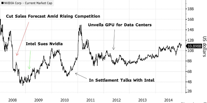 Следующие шесть лет были испытанием для Nvidia. Акции упали в 2008 году, поскольку финансовый кризис ослабил спрос, а давно страдающий конкурент Advanced Micro Devices Inc начал выбираться из кризиса.