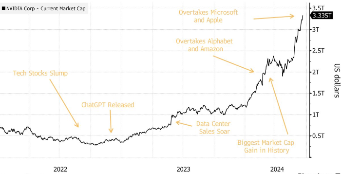 На этой неделе победоносное шествие Nvidia достигло кульминации: компания сместила Microsoft Corp с позиции самой дорогой компании в мире с рыночной капитализацией в $3,34 трлн. Более $2 трлн этой стоимости было добавлено в этом году.