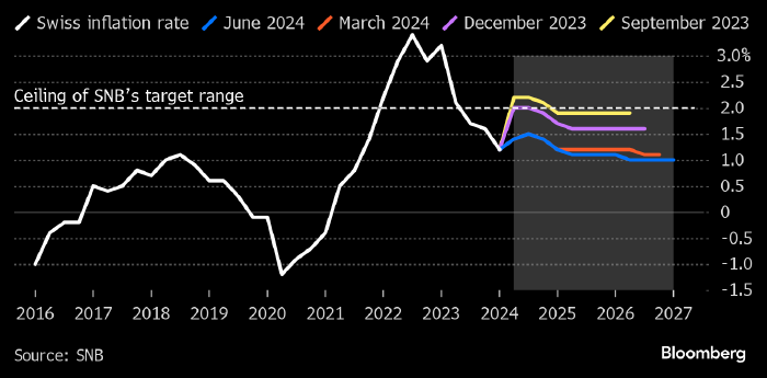 Инфляция в Швейцарии: синим — июнь 2024, оранжевым — март 2024, розовым — декабрь 2023, желтым — сентябрь 2023. Источник: Bloomberg