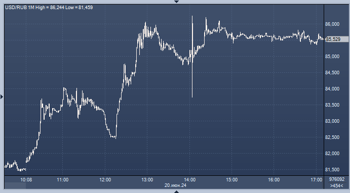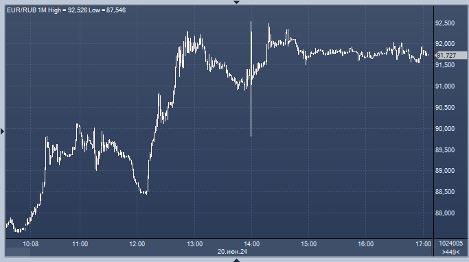 Торги долларами и евро не проводятся на Московской бирже с 13 июня из-за санкций. В этой связи наиболее подходящими ориентирами (в том числе для внебиржевого рынка) колебаний курса являются котировки однодневного фьючерсного контракта с автопролонгацией на курс "доллар США - российский рубль" (USDRUBF) и такого же контракта на курс "евро - российский рубль" (EURRUBF). Контракт USDRUBF вырос относительно закрытия предыдущего торгового дня к 15:00 мск на 4,29 рубля, до 85,85 руб./$1, контракт EURRUBF поднялся на 3,92 рубля, до 92,14 руб./EUR1.