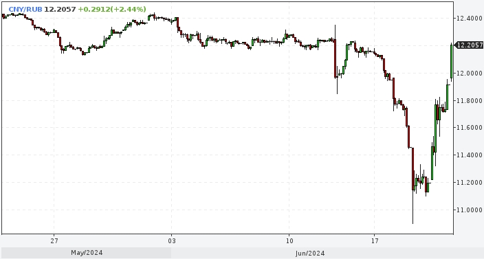 Рубль на Мосбирже по итогам торгов 20 июня подешевел против юаня почти на 76 копеек до 11,95 за единицу китайской валюты и растерял все достижения двух предыдущих торговых дней.