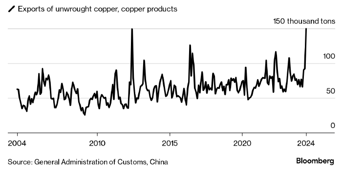 Экспорт меди из Китая в прошлом месяце достиг рекорда, поскольку низкий спрос на внутреннем рынке вынудил трейдеров искать рынки сбыта за рубежом. Согласно последним таможенным данным, в мае объем экспорта некованой меди и изделий из нее из Китая удвоился по сравнению с предыдущим годом и составил почти 150 000 тонн, превысив предыдущий максимум, достигнутый в 2012 году.