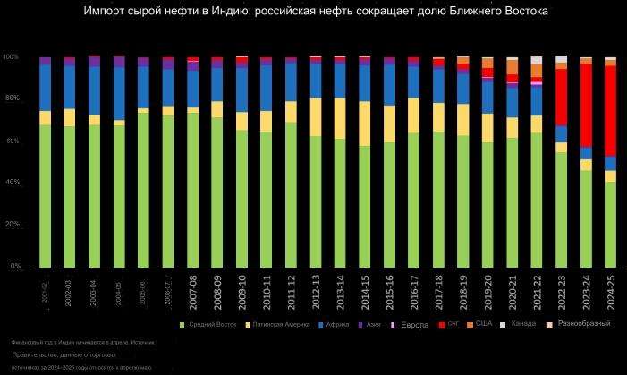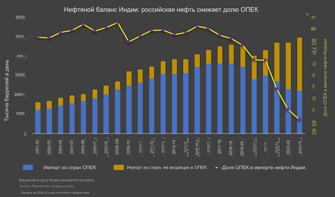 Рост потребления российской нефти снижает долю ближневосточной нефти в индийском сырьевом балансе, а также долю картеля производителей нефти ОПЕК, свидетельствуют данные.