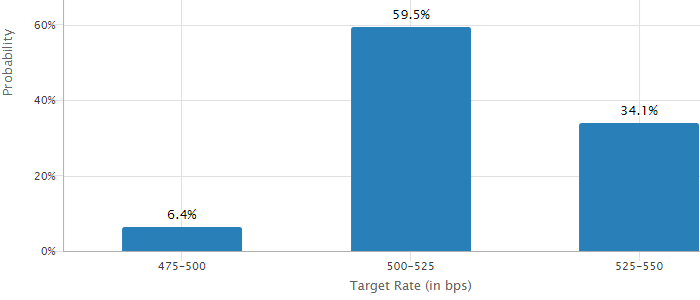 Тем не менее эти данные могут спровоцировать значительные колебания курса доллара через изменение ожиданий по ставкам. На данный момент рынок фьючерсов на ставку по федеральным фондам учитывает в ценах ее снижение с текущих уровней на 0,47% к концу года. Вероятность ее снижения на 0,25% в июле оценивается рынком в 10,3%, а сентябре — в 59,5% (см. ниже).