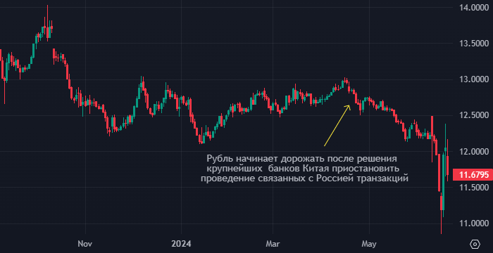 Текущая волна укрепления рубля против юаня, доллара и евро началась в апреле: тогда, по данным Reuters, крупнейшие банки Китая, включая Agricultural Bank of China, Bank of China и China Construction Bank, приостановили проведение связанных с Россией транзакций, опасаясь вторичных санкций со стороны США. Это вынудило российских и китайских контрагентов перевести операции в менее крупные банки и даже перейти на альтернативные варианты взаиморасчетов, включая криптовалюту, писал тогда Reuters.