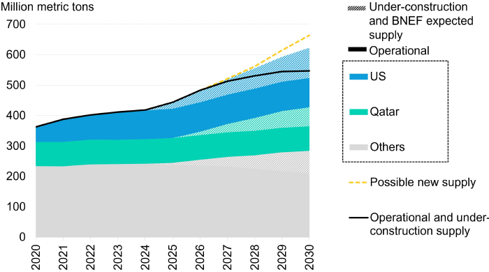 42% от прироста придется на долю США, немногим меньше — на катарское месторождение North Field. Совокупная доля США и Катара на мировом рынке СПГ в 2030 году превысит 50% против 42% в 2023 году, прогнозирует BloombergNEF.