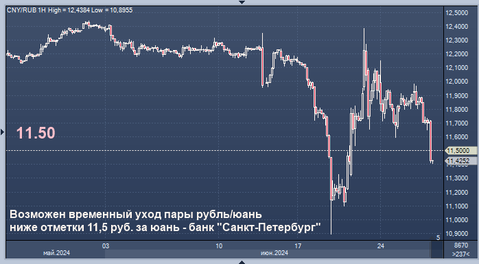 Возможен временный уход пары рубль/юань ниже отметки 11,5 руб. за юань в связи с фактором налогового периода, полагают аналитики банка "Санкт-Петербург".
