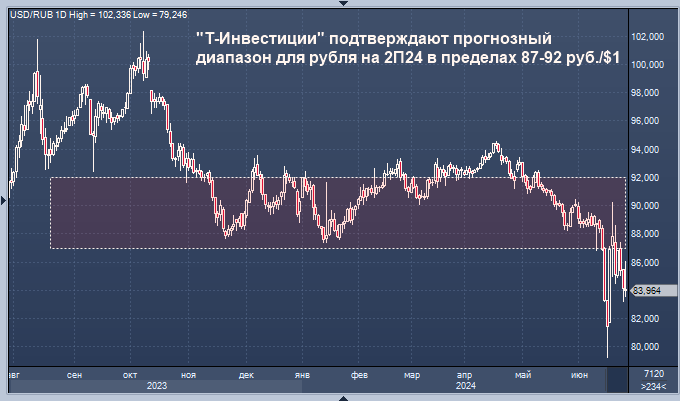 "Т-Инвестиции" подтверждают прогнозный диапазон для рубля на 2П24 в пределах 87-92 руб./$1, сообщается в комментарии главного экономиста Софии Донец.