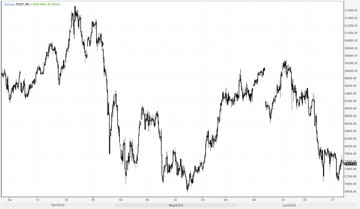 Фьючерсы на какао в Нью-Йорке и Лондоне поднялись до рекордных максимумов в этом году, причем цены в Нью-Йорке превысили $12 000 за тонну в апреле. Плохая погода и болезни уничтожили урожай в Гане и Кот-д’Ивуаре, где выращиваются две трети мировых какао-бобов, а хедж-фонды устремились на рынок, усиливая спрос.