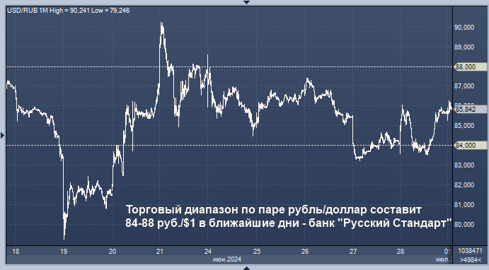 Вероятный торговый диапазон на ближайшие дни, по мнению Тимошенко, составляет 84-88 руб./$1 и 91-95 руб./EUR1. Настоящее сообщение содержит мнение специалистов инвестиционной компании или банка, полученное Интерфаксом. Такое мнение предоставляется исключительно для целей ознакомления и не является рекомендацией для покупки, продажи ценных бумаг, принятия (или непринятия) каких-либо коммерческих или иных решений. За содержание сообщения и последствия его использования Интерфакс ответственности не несет.