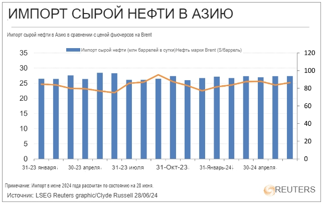 Азия импортировала 27,16 млн баррелей в день (б/с) сырой нефти в период с января по июнь, что на 130 000 б/с меньше, чем 27,29 млн б/с за тот же период 2023 года, согласно данным, собранным LSEG Oil Research.