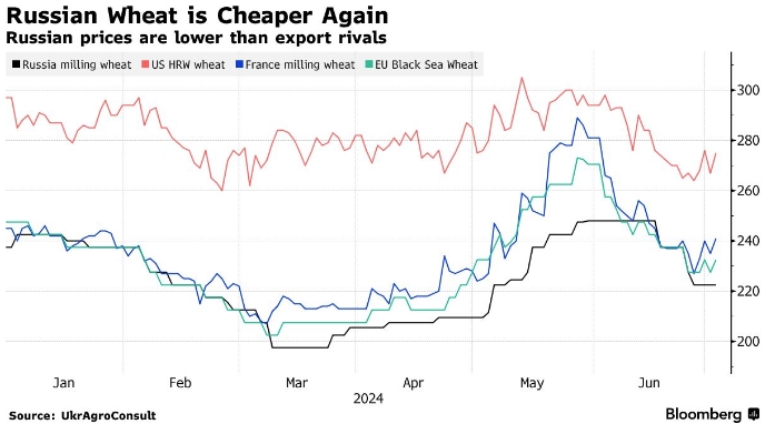 Российская пшеница снова дешевле. Российские цены ниже, чем у конкурентов по экспорту. Российская продовольственная пшеница. Американская пшеница HRW. Франция мукомольная пшеница. Черноморская пшеница ЕС. Источник: УкрАгроКонсалт, 2024 год. Блумберг