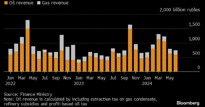Налоговые поступления от нефти подскочили до 590,6 млрд рублей ($6,7 млрд) в прошлом месяце по сравнению с 402,8 млрд рублей в июне 2023 года, пишет Bloomberg со ссылкой на собственные расчеты, основанные на данных Минфина РФ. Общий объем нефтегазовых доходов РФ вырос в июне на 41% г/г до 746,6 млрд рублей, говорится в сообщении министерства.