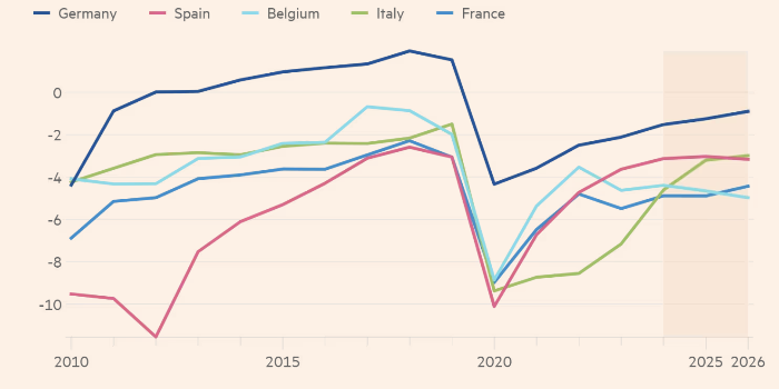 Баланс бюджета европейских стран в процентном отношении к ВВП. Источник: The Financial Times