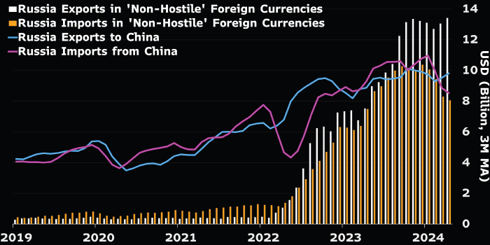 По нашим оценкам, с января по апрель положительное сальдо торгового баланса России в юанях составляло в среднем 4,9 миллиарда долларов в месяц, в то время как общее положительное сальдо ее торгового баланса составляло 11,3 миллиарда долларов.