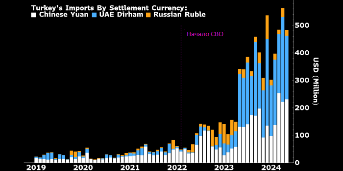 Импорт Турции в млн USD, оплачиваемый в следующих валютах: белым — китайский юань, голубым — дирхам ОАЭ, оранжевым — российский рубль. Источник: Bloomberg