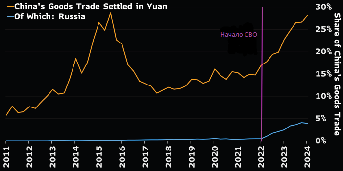 В глобальном масштабе переход на юань происходит быстро, но китайской валюте все еще очень далеко до доллара. По данным SWIFT, доля юаня в мировом торговом финансировании выросла с 1,9% в январе 2022 года, т. е. до начала СВО, до 5,1% в мае 2024 года.