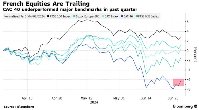 Тем не менее, вне зависимости от того, какая партия одержит верх на парламентских выборах во Франции, некоторые инвесторы считают, что это означает начало более бурного периода для рынков акций и облигаций страны. С момента объявления внеочередных выборов в прошлом месяце индекс CAC 40 показал худшие результаты среди основных европейских фондовых индексов, а в разгар распродажи индикатор риска на рынке облигаций взлетел до самого высокого уровня со времен кризиса суверенного долга.