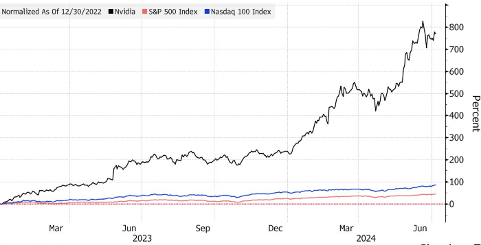 Nvidia торгуется почти в 23 раза выше предполагаемой выручки за следующие 12 месяцев, что делает ее самой дорогой акцией в индексе S&P 500 по этому показателю. Она также занимает второе место по эффективости среди компаний S&P 500 в этом году, уступая только Super Micro Computer Inc, еще одному фавориту среди инвесторов в ИИ. Рост увеличил рыночную капитализацию Nvidia на $1.9 трлн, позволив ей ненадолго получить титул крупнейшей компании в мире.