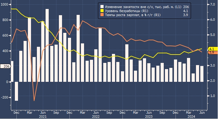 Министерство труда США сообщило 5 июля, что число рабочих мест вне сельского хозяйства за месяц увеличилось на 206 тыс., что выше прогноза +200 тыс., но ниже пересмотренного в сторону понижения прироста на 218 тыс. в мае. Уровень безработицы неожиданно вырос до 4,1%, что является самым высоким показателем с октября 2021 года и является противоречивым сигналом для чиновников Федеральной резервной системы, обдумывающих свой следующий шаг в денежно-кредитной политике. Прогнозировалось, что уровень безработицы останется стабильным на уровне 4%. Средняя почасовая оплата труда выросла на 0,3% за месяц и на 3,9% по сравнению с прошлым годом. Темпы замедлились по сравнению с +0,4% м/м и -4,1% г/г в мае.