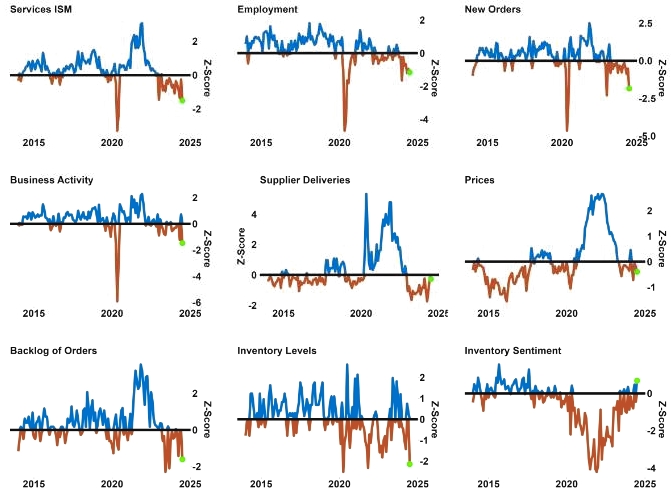 Компоненты индекса ISM в сфере услуг в сравнении с собственным средним за 10 лет значением.