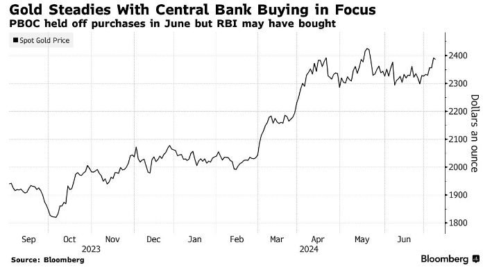 Золото торговалось вблизи отметки 2 380 долларов за унцию после роста почти на 3 % на прошлой неделе. В июне Народный банк Китая второй месяц не добавлял золото в свои резервы, но отчет из Индии показал, что центральный банк страны, вероятно, увеличил свои запасы желтого металла максимальными темпами почти за два года.
