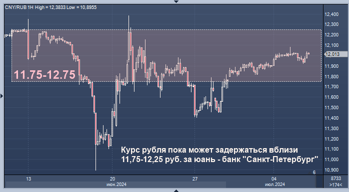 Курс пары юань/рубль в сложившихся условиях пока может задержаться вблизи уровней 11,75-12,25 руб./юань, полагают аналитики банка "Санкт-Петербург".