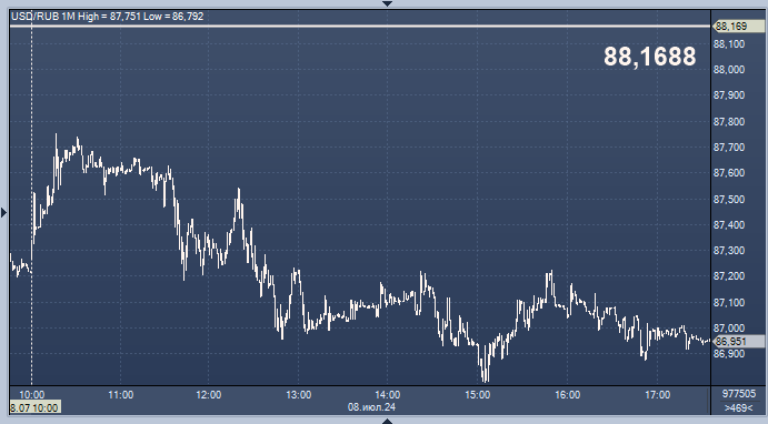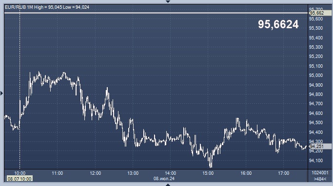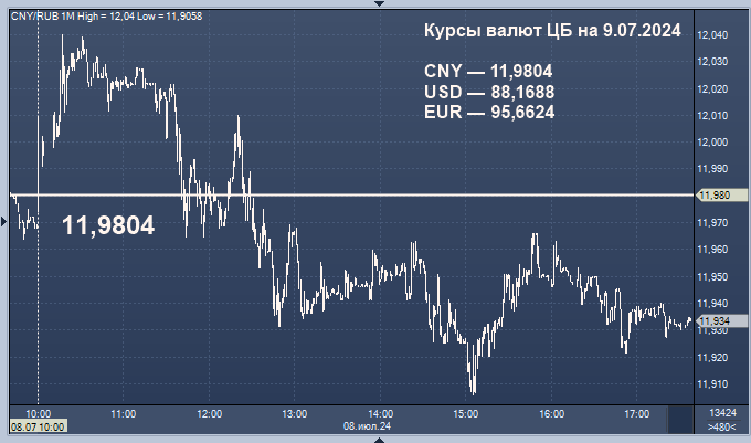Китайский юань растерял утренний рост и развернулся вниз на Московской бирже днем в понедельник. Рубль перешел к небольшому укреплению, однако продолжает торговаться в узком диапазоне. Торги долларами и евро не проводятся на Московской бирже с 13 июня из-за санкций. Цены на нефть опускаются днем в понедельник. Давление на рынок оказывают сигналы замедления роста американской экономики, а также некоторое ослабление геополитических опасений в связи с возобновлением переговоров о прекращении огня между Израилем и ХАМАС.