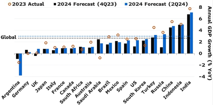 Среди основных развивающихся рынков из-за обвала на рынке недвижимости в Китае темпы роста не достигли официального целевого показателя в 5%. Индия, благодаря благоприятным факторам, связанным с укреплением цепочек поставок и демографическими дивидендами, может превзойти этот показатель. В целом прогнозируется, что в 2024 году рост составит 4,2% по сравнению с 4,5% в 2023 году.