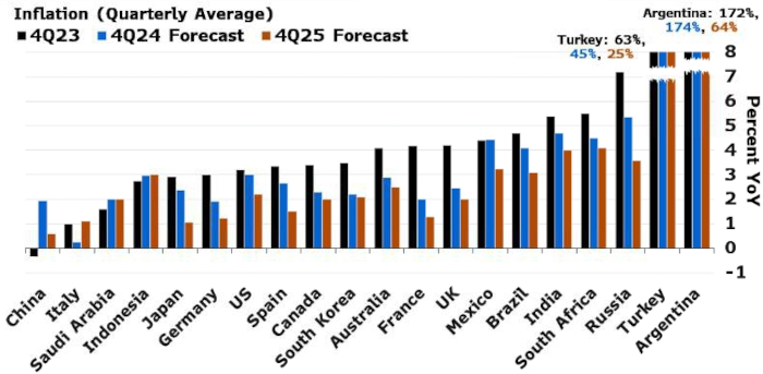 Bloomberg Economics прогнозирует постепенное возвращение инфляции в США к целевому показателю к 2025 году, при этом снижение инфляции в еврозоне и Великобритании будет происходить более быстрыми темпами. В странах с развитой экономикой, вместе взятых, рост цен к концу 2024 года составит около 2,5%, по сравнению с 3,1% в конце 2023 года и 7,8% в конце 2022 года, и приблизится к 1,8% в конце 2025 года.
