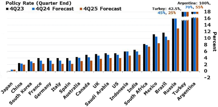 В Азии Народный банк Китая, вероятно, усилит стимулирующие меры, как только ФРС начнет действовать. Освободившись от смирительной рубашки, регулирующей кривую доходности, Банк Японии продолжит нормализацию политики, а повышение ставок в июле и октябре поможет остановить свободное падение иены. Если сложить все это, то ставка глобального центрального банка, взвешенная по ВВП, снизится с 7,1% в конце 2023 года до 6,5% в конце 2024 года и 5% в конце 2025 года.