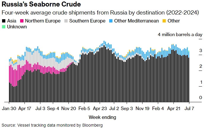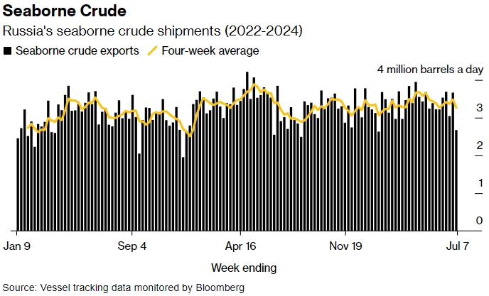 Валовая стоимость российских поставок нефти также снизилась за семь дней до 7 июля, но это падение было смягчено четвертым подряд недельным ростом цен на нефть. Морские поставки нефти из России (2022-2024 гг.). Источник: Данные отслеживания судов Bloomberg