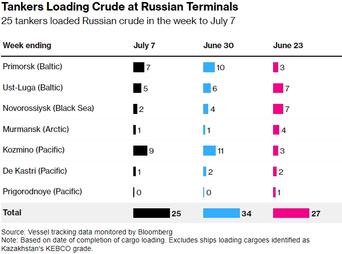 Танкеры, загружающие нефть на российских терминалах. 25 танкеров погрузили российскую нефть на неделе по 7 июля. Источник: Данные отслеживания судов Bloomberg. Примечание: По дате окончания погрузки. Исключая суда, загружающие грузы, идентифицированные как казахстанский сорт KEBCO.