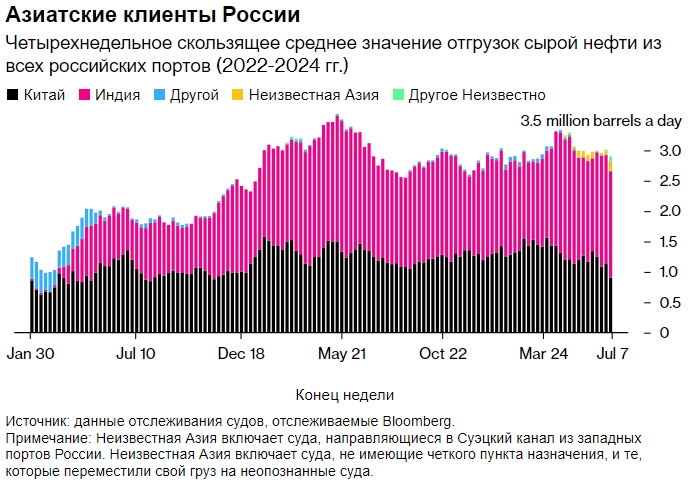 Российская нефть на морском шельфе. Средние четырехнедельные поставки нефти из России по направлениям (2022-2024 гг.). Источник: Данные отслеживания судов, отслеживаемые Bloomberg