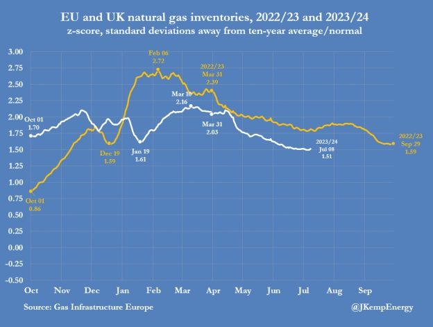 Запасы природного газа в ЕС и Великобритании, 2022/23 и 2023/24 гг., стандартные отклонения от среднего/нормального значения за десять лет. Источник: Газовая инфраструктура Европы.