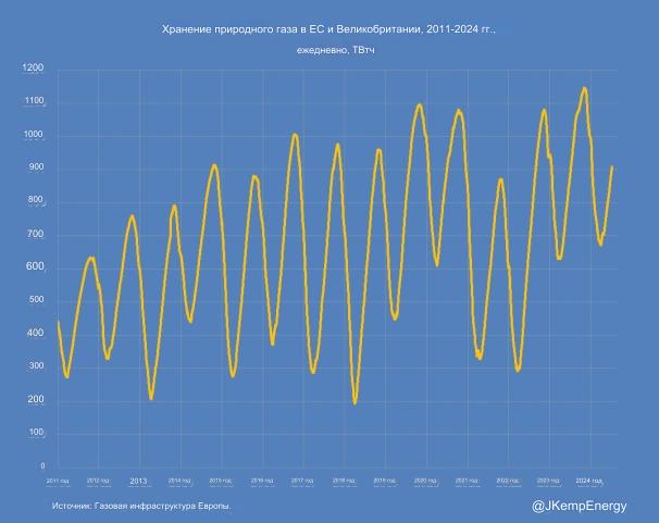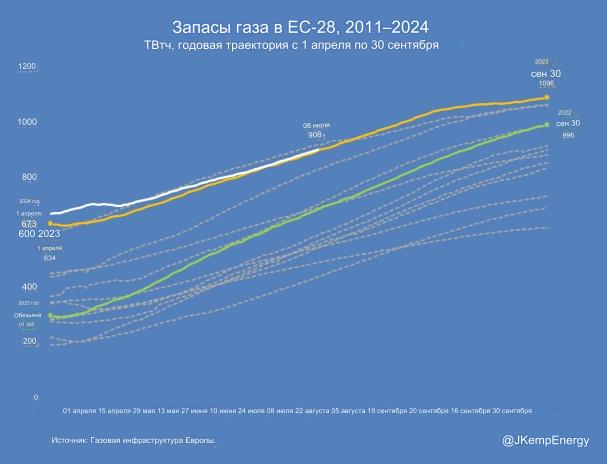 Исходя из тенденций последнего десятилетия, прогнозируется, что запасы достигнут 1 204 ТВт-ч до начала зимнего периода в конце октября или начале ноября.