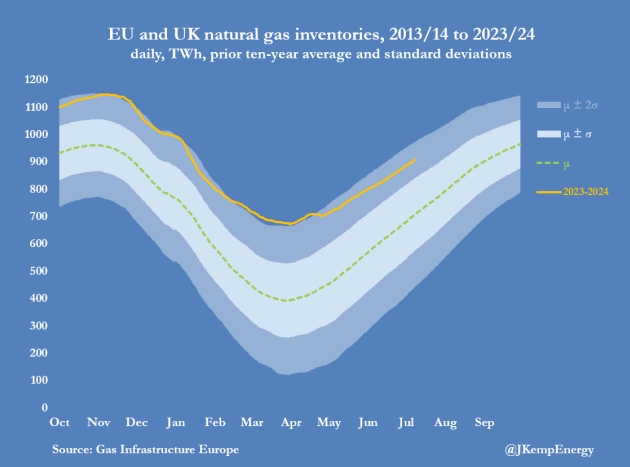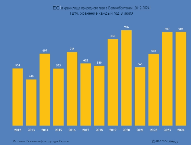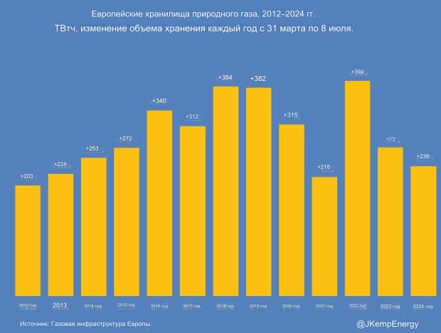По состоянию на 8 июля хранилища были заполнены чуть менее чем на 80 %, что выше среднего десятилетнего показателя в 64 %, но соответствует уровню 2023 года и ниже рекордного уровня заполнения во время пандемии в 2020 году.