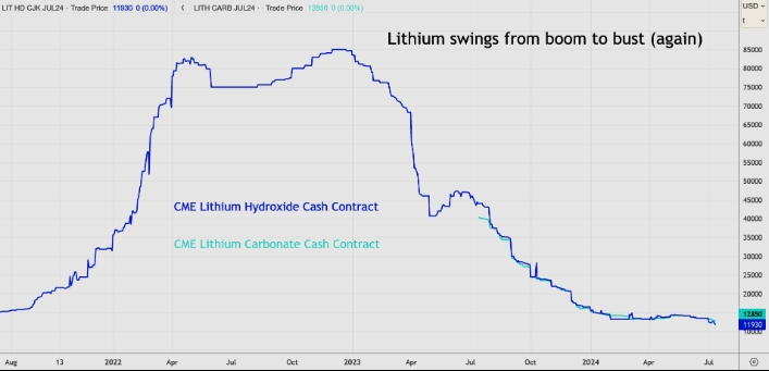 Контракт CME на гидроксид лития рухнул с максимума 2022 года в $85 000 за метрическую тонну до $11 930. Контракт CME на карбонат стоил более $40 000, когда он начал торговаться в июле 2023 года, и с тех пор упал до $12 850.