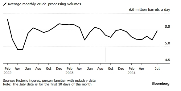 По словам источника, с 6 по 10 июля ежедневная загрузка нефтеперерабатывающих заводов сократилась более чем на 80 000 баррелей по сравнению с первыми тремя днями месяца.