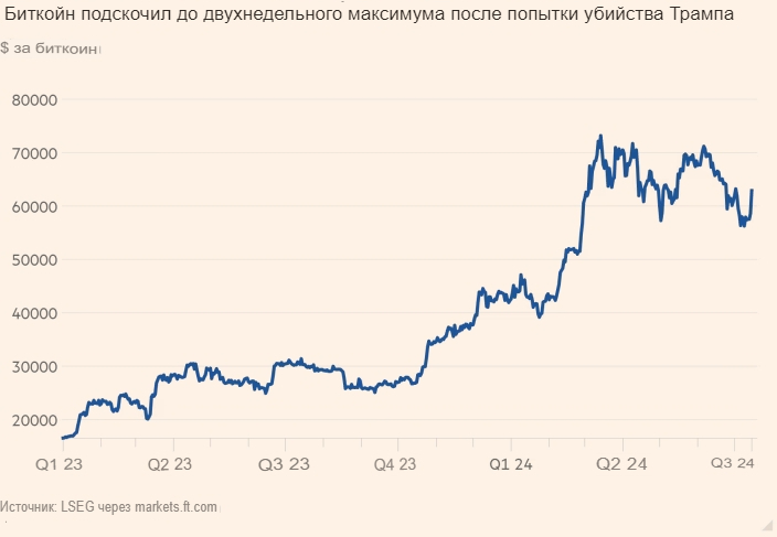 Цена биткоина выросла более чем на 10 процентов до 63 595 долларов США, самого высокого уровня за две недели, после того как Трамп был ранен в ухо во время покушения, совершенного стрелком на предвыборном митинге в выходные. Республиканца считают благосклонным к криптовалютам: он принимал руководителей отрасли в Мар-а-Лаго и с энтузиазмом отзывался о майнинге биткоинов в США.